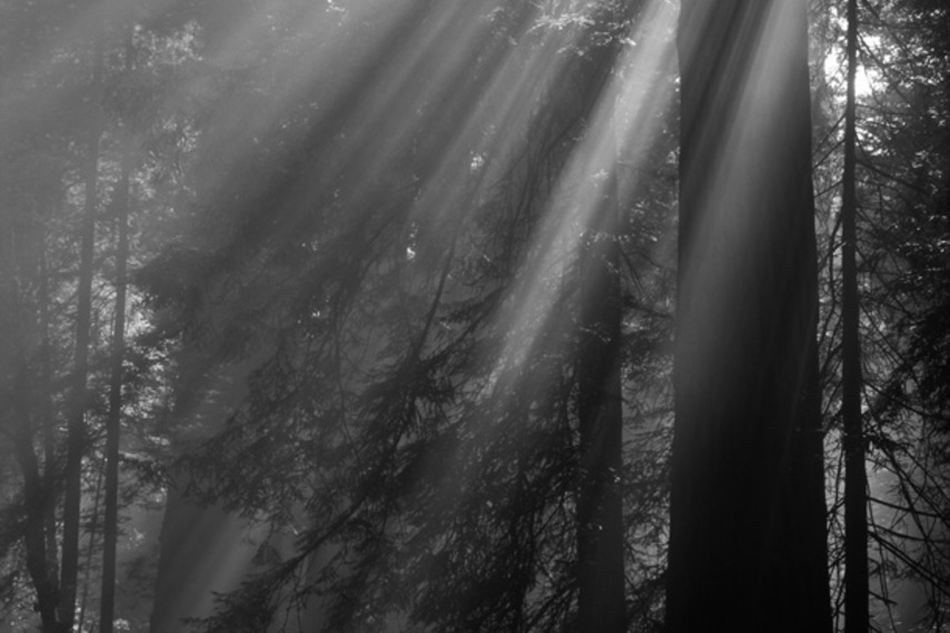 Godbeams of light penetrate the dense redwoods of California.